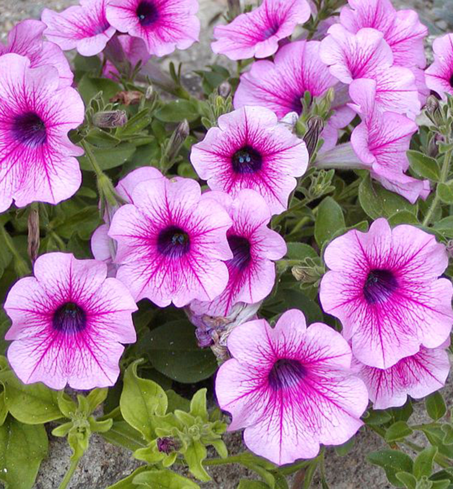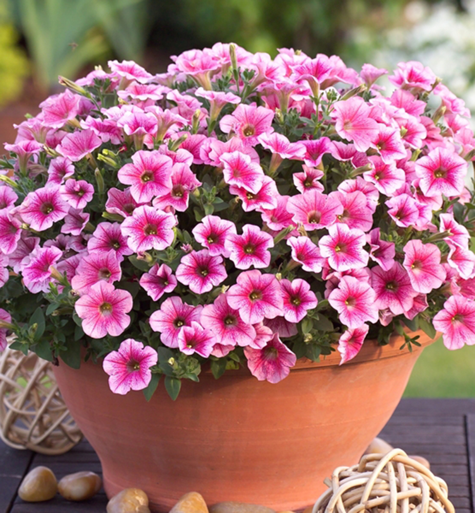 Eigenschaften: Die beliebte Surfinie ´PINK VEIN‘ blüht mit altrosa Blüten, die von dunklen Adern durchzogen sind. Zur Blütenmitte hin wird die rosa Farbe intensiver. Die überhängenden Triebe machen diese Sorte ideal für die Bepflanzung von Hängetöpfen und Balkonschalen.