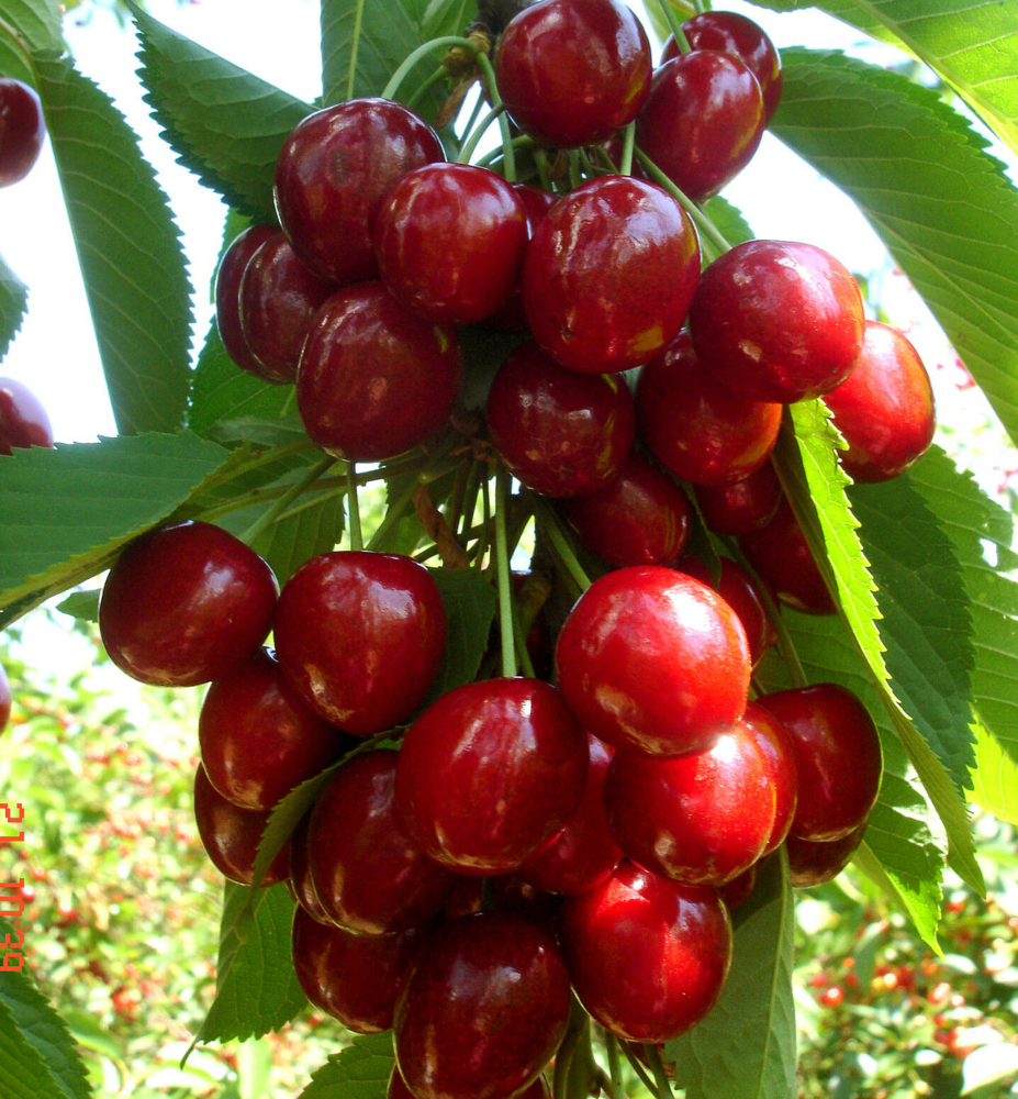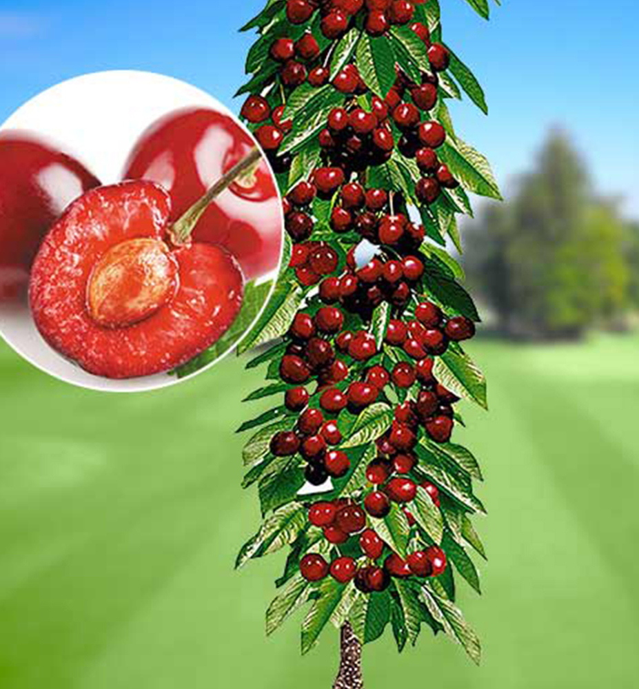 Eigenschaften: Die Kirsche „QUEEN MARY“ ist eine selbstbestäubende, mittelfrühe Sorte, die sich durch eine früh einsetzende Fruchtbarkeit und regelmäßige Ernten auszeichnet. Die Früchte sind groß, herzförmig und rot gefärbt. Das Fruchtfleisch ist rot, knusprig, saftig und hat einen süßen Geschmack. In der 5. bis 6. Kirschwoche reifen die Kirschen und die Triebe wachsen sehr üppig. Die Form des Baumes ist sehr schlank, er wächst in einer Säulenform, die wir durch Schneiden verändern. Sie eignet sich für den Anbau in kleineren Gärten, in Kübeln oder in Zierbeeten. In den ersten Jahren werden nur lange Seitentriebe gekürzt. Auch die Gesamthöhe des Baumes kann durch Beschneiden angepasst werden.