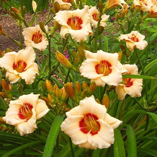 Eigenschaften:Die Taglilie 'BRILLANT CIRCLE' ist eine äußerst interessante Sorte, die vor allem durch ihre etwa 9 cm großen, cremerosa Blüten auffällt. Der kontrastreiche himbeerrote Mittelpunkt zieht nicht nur nützliche Insekten an, sondern auch das Auge des Gärtners. Es bildet einen nahezu regelmäßigen Kreis, was schon aus dem Namen der Pflanze hervorgeht. Die Blätter sind schmal, haben eine frische grüne Farbe und wachsen als üppiger Büschel, der bis in den Spätherbst Blumenbeete schmückt. Eine Blüte blüht maximal 24 Stunden, deshalb wählen wir für die Vase Stiele mit mehreren Knospen. Taglilien werden überwiegend in gemischten Staudenbeeten oder in Gruppenpflanzungen gepflanzt.