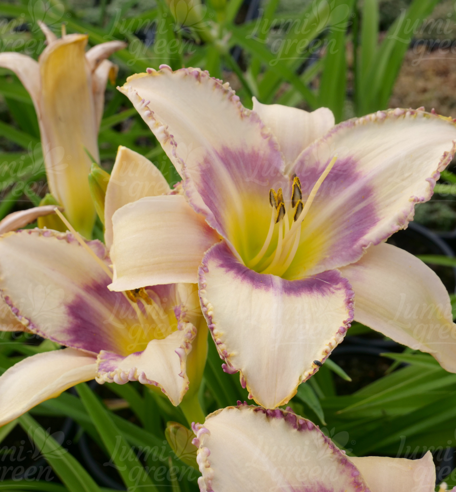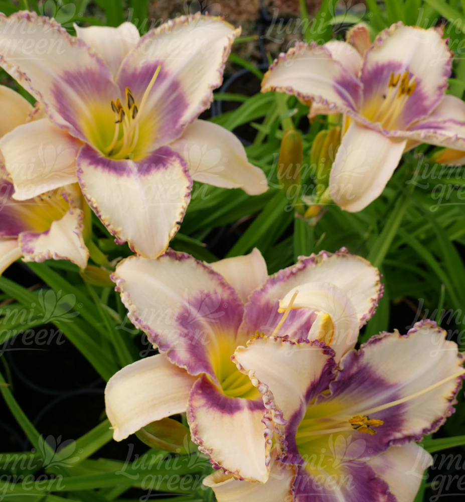 Eigenschaften: Sie müssen die Taglilie ´DESTINED TO SEE´ sehen. Die cremefarbene Farbe der Blütenblätter wird durch die rosa-violette Zeichnung in der Mitte und an den Rändern der Blütenblätter attraktiv hervorgehoben. Der innere Kelch ist gelbgrün gefärbt. Diese atypische Farbgebung belebt jede sommerliche Staudenbepflanzung oder jeden Topf. Darüber hinaus verbreiten sie einen angenehm süßen Duft um sich herum. Die Blätter wachsen aufrecht in einem kompakten Büschel, sind schmal und frischgrün gefärbt.