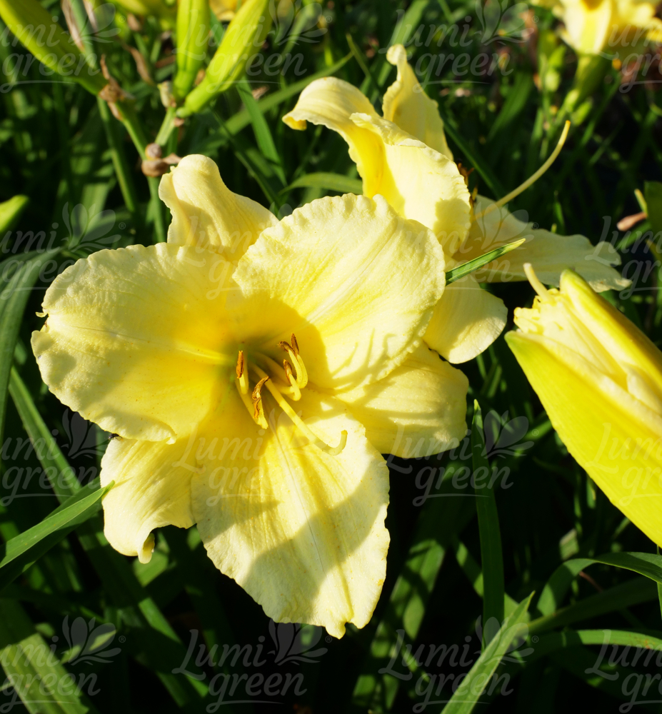 Helle remontierende Taglilie mit großen duftenden gelben Blüten.