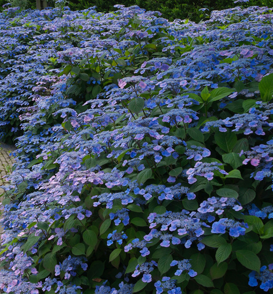 Neue, einzigartige Hortensie, ideal für eine Blütenhecke, mit wunderschönen tiefblauen Blüten.