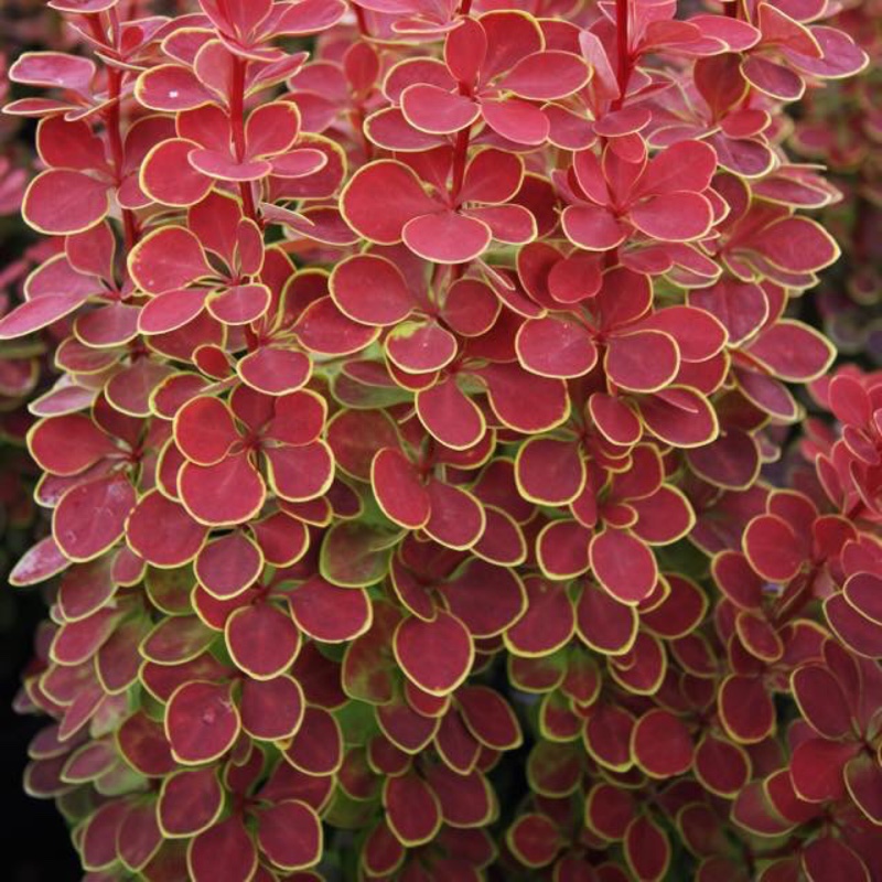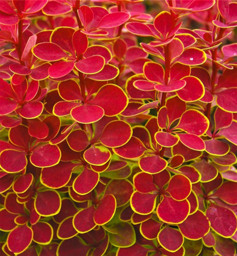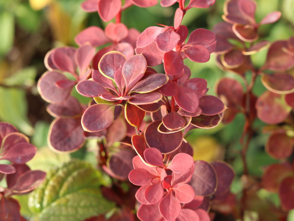 Aufrecht wachsender Berberitzenstrauch mit orange-roten Blättern und goldenem Rand.