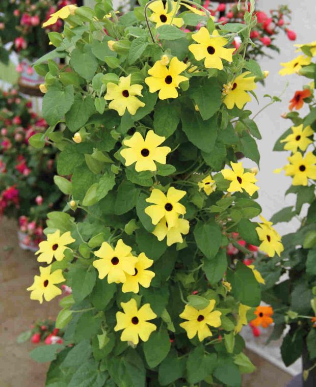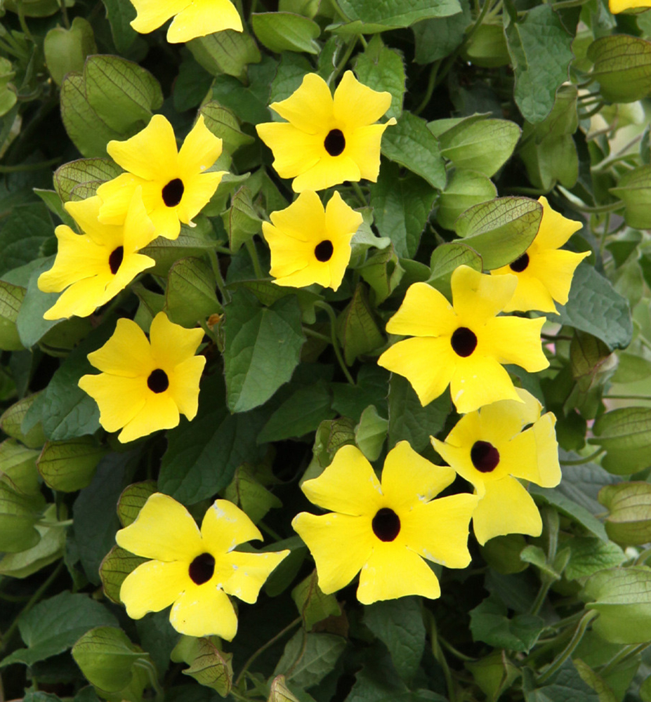 Die Sorte ´SUNNY SUSY® GELB´, auch bekannt als „Schwarzäugige Susanne“, besticht durch ihre perfekte Kombination aus gelben Blüten mit einem markanten schwarzen Auge. Dank ihres überhängenden Wuchses eignet sie sich ideal für die Bepflanzung an Säulen, Mauern oder in Hängeampeln. Auch in Kombination mit Metallkonstruktionen wirkt sie sehr ansprechend. Die überhängenden Triebe können bis zu 2 m lang werden.