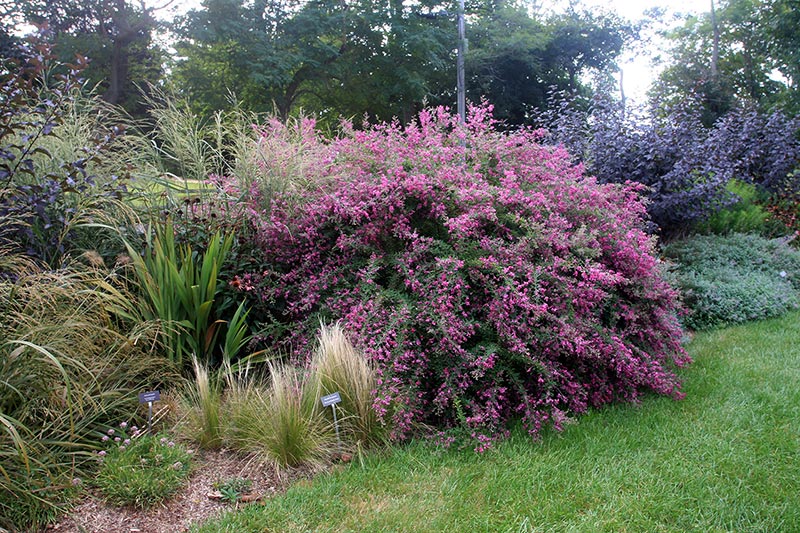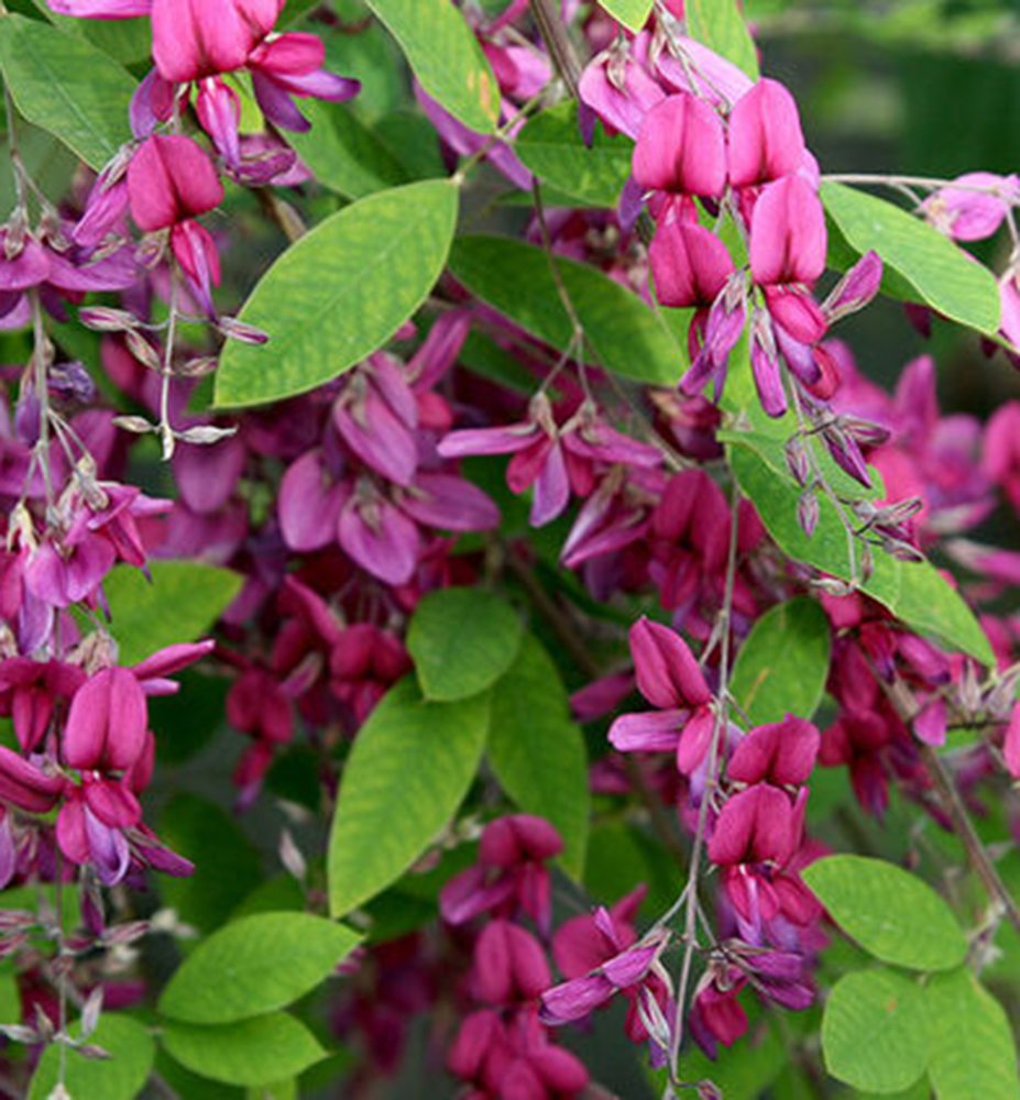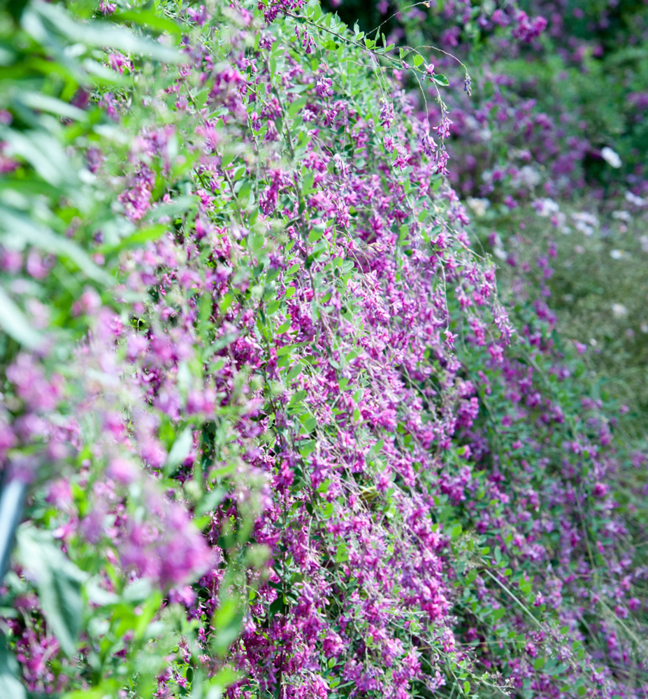 Eigenschaften: Lespedeza thunbergii, allgemein Thunbergs Buschklee genannt, ist ein blättriger, halbholziger Strauch aus der Familie der Hülsenfrüchte. Er zeichnet sich durch wechselständige, dreiblättrige grüne Blätter sowie herabhängende, rosa-violette, erbsenähnliche Blüten aus. Die Blütezeit liegt im Spätsommer bis Frühherbst, vorzugsweise an sonnigen Standorten. Sein charakteristischer Duft zieht Schmetterlinge und viele andere Insekten an, weshalb die Pflanze zu den hervorragenden Bestäubern zählt. Am Ende der Vegetationsperiode stirbt der oberirdische Teil ab, daher empfiehlt es sich, diesen zurückzuschneiden.