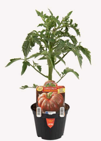 Eigenschaften: Die Sorte 'CAPPUCCINO' ist eine mittelfrühe Stabtomate, geeignet für den Anbau im Gewächshaus und an geschützten Standorten im Freiland. Die großen, flachrunden, gerippten Früchte wiegen etwa 200–300 g und wachsen in Büscheln zu 2–4 Stück. Das Fleisch ist fest, süß und reich an Antioxidantien, die die charakteristische purpurrote Farbe verleihen. Die Sorte ist widerstandsfähig gegen viele Krankheiten und weist eine hohe Platztoleranz auf.