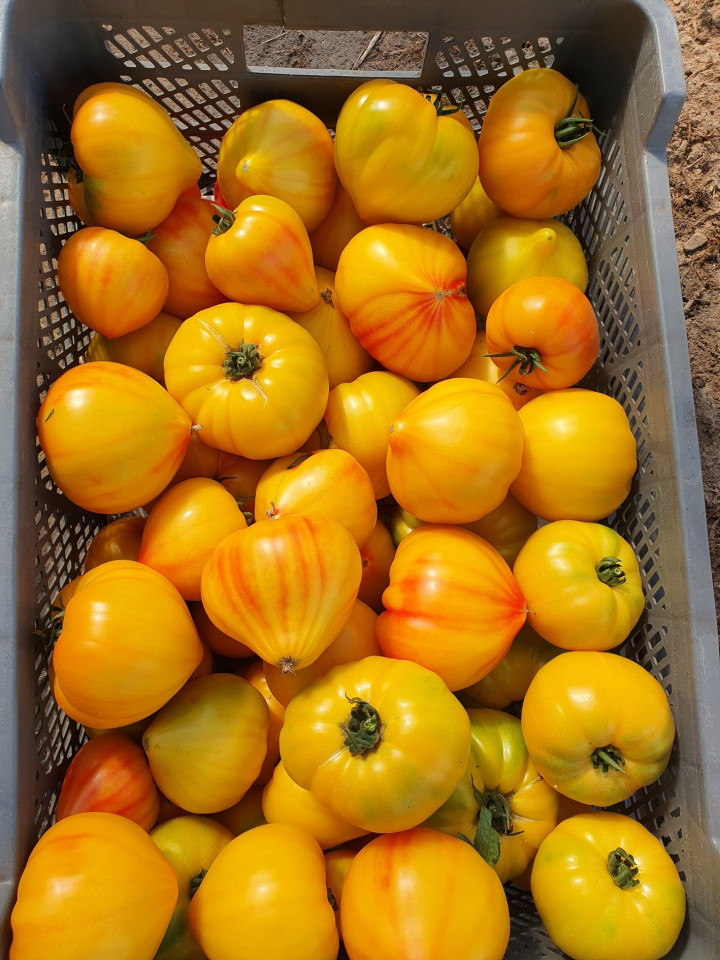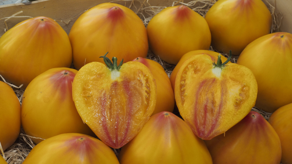 Großfrüchtige Tomatensorte mit aromatischen, gelb-roten, herzförmigen Früchten.