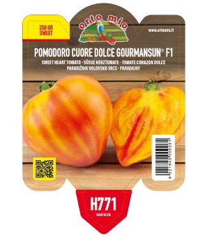 Eigenschaften: Die Tomatensorte 'GOURMANSUN F1' besticht durch ihre außergewöhnlichen Früchte, die die ganze Saison über geerntet werden können. Die großen, herzförmigen Früchte haben eine einzigartige, marmorierte Farbe in Orange- und Rottönen und wiegen 200–300 g. Sie eignen sich für den Frischverzehr sowie für Salate, Sandwiches oder zum Backen. Die Sorte ist geeignet für den Anbau in Kunststoffbehältern, Gewächshäusern und im Freiland.