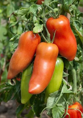 Eine Tomatensorte mit zarten, ungewöhnlich länglichen roten Früchten.
