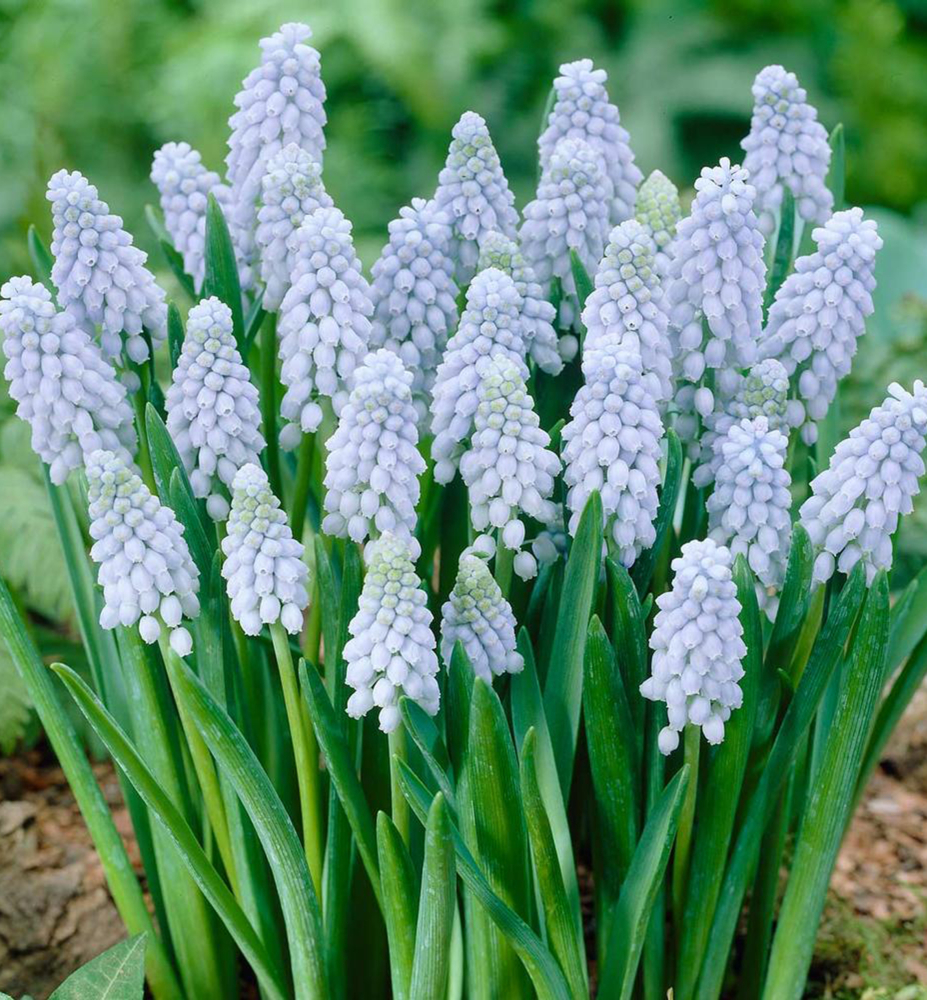 Eigenschaften: Traubenhyazinthe ´Valerie Finnis´ ist eine anspruchslose Blumenzwiebel, die im Frühling mit hellblauen, traubenähnlichen Blüten blüht. Die Blüten sind glockenförmig. Blütenstände wachsen an aufrechten, fleischigen Stielen. Es wächst in Büscheln, die Blätter sind schmal und dunkelgrün gefärbt.