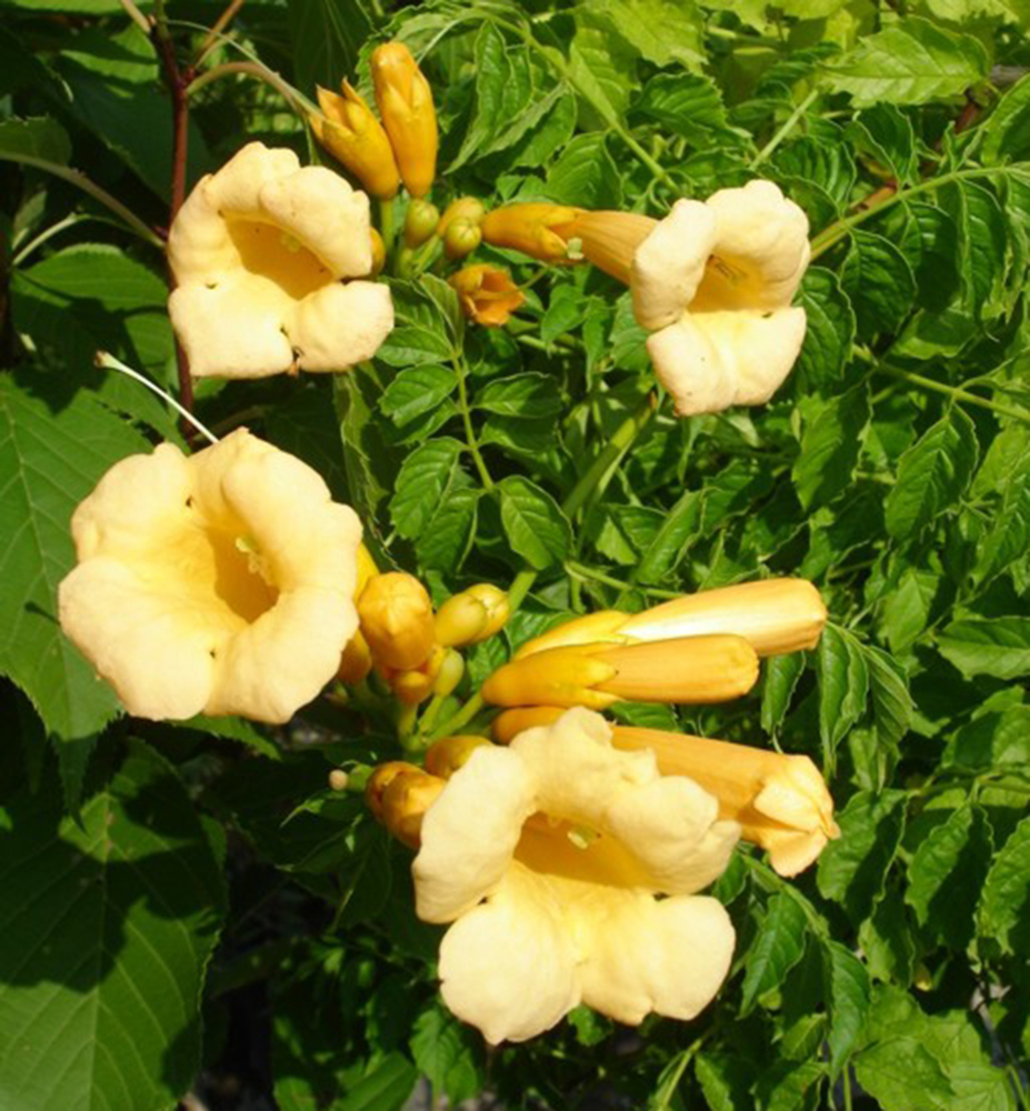 Eigenschaften: Die Trompetenblume ´YELLOW TRUMPET´ ist eine attraktive Kletterpflanze mit trichterförmigen, leuchtend goldgelben Blüten. Ihr Duft zieht zahlreiche Insekten an. Die Blütezeit erstreckt sich von Juli bis September. Die gefiederten Blätter sind satt dunkelgrün und laubabwerfend. Unbeschnittene Triebe können Pergolen, Zäune, Säulen oder andere Stützen erklimmen.