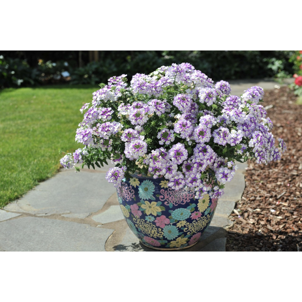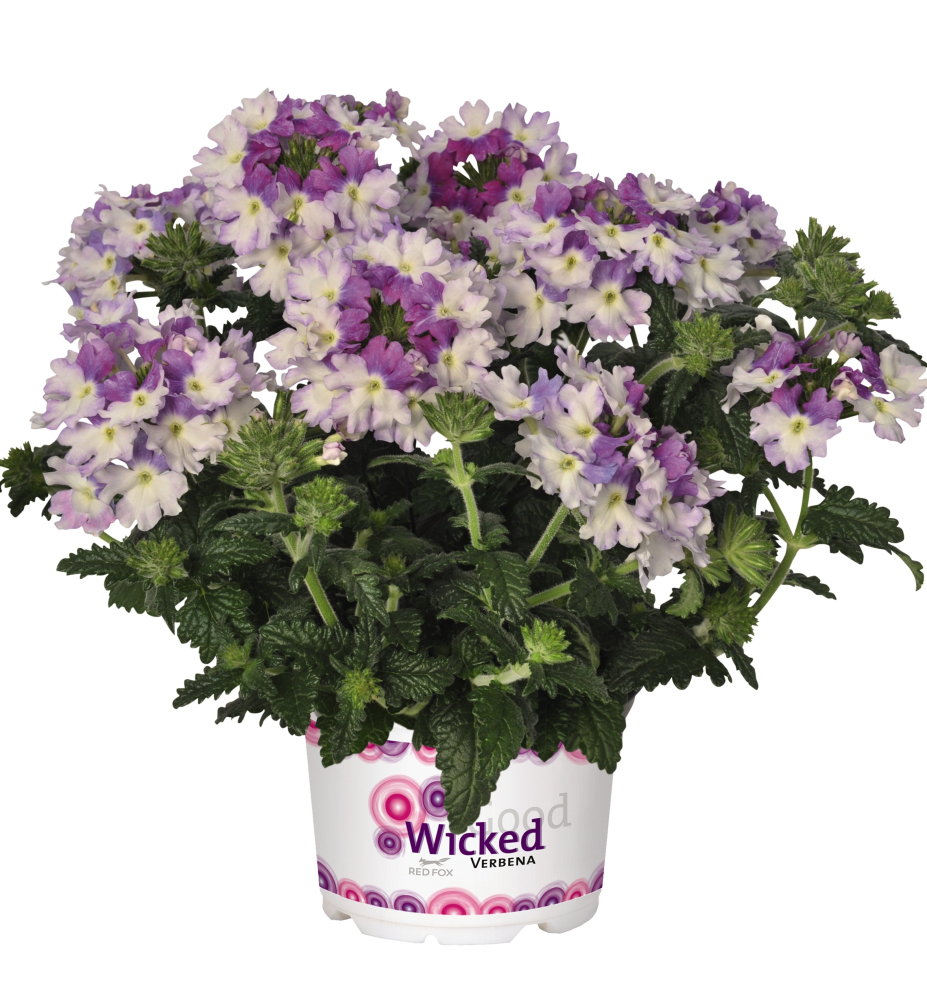 Eigenschaften: Die ursprüngliche Art stammt aus Südamerika. Heute werden seine Hybriden kultiviert, die sich durch aufrechten oder hängenden Wuchs unterscheiden. Die Sorten der 'WICKED®'-Gruppe sind halbhängend und haben kräftige Blüten, die vom Frühsommer bis Oktober blühen. Sie haben zweifarbige Blüten, die äußerst wirkungsvoll sind. Die Verbene 'WICKED® PURPLE' blüht mit außergewöhnlichen lila-weißen Blüten.