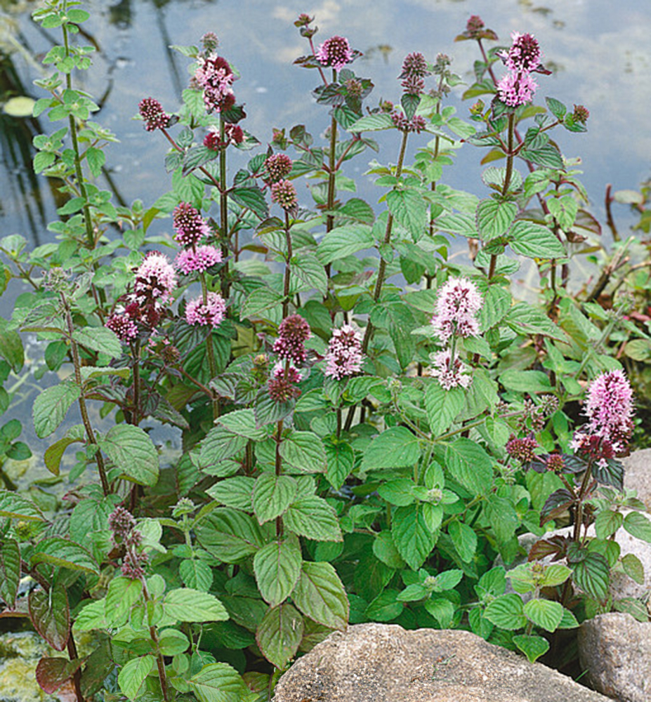 Eigenschaften: Die Wasserminze ist eine mehrjährige Wasserpflanze mit grünen, gegenständig angeordneten Blättern. An den rötlich gefärbten Stängeln erscheinen Ähren mit blauvioletten Blüten, die von Juli bis September blühen. Die gesamte Pflanze ist aromatisch und verströmt den typischen Minzduft. Sie erreicht eine Höhe von 30–50 cm und eignet sich hervorragend zur Bepflanzung von Teichrändern oder feuchten Beeten.
