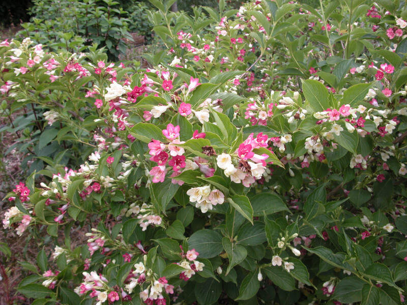 Ein üppig blühender Laubstrauch mit rosa und cremeweißen Blüten.