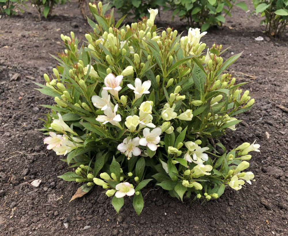 Zwerg Weigelie mit vielen attraktiven weißen Blüten und kompakter Statur.