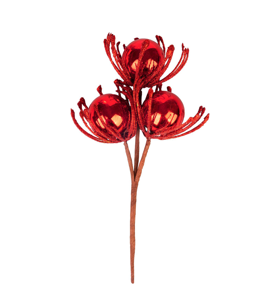Eigenschaften: Dieser rote Weihnachtszweig verleiht Ihrem Zuhause eine zauberhafte Weihnachtsatmosphäre. Die mit glänzenden Kugeln verzierte Dekoration sorgt für einen einzigartigen und strahlenden Look. Der Zweig eignet sich ideal als Dekoration für Weihnachtsbaum, Vasen, Kränze oder Tischgestecke. Dank seiner markanten roten Farbe harmoniert er perfekt mit traditionellem Weihnachtsschmuck. Die Höhe beträgt 22 cm.