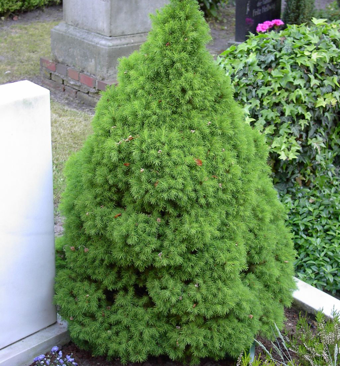 Ein langsam wachsender Nadelbaum mit regelmäßiger, konischer Form und feinen Nadeln.