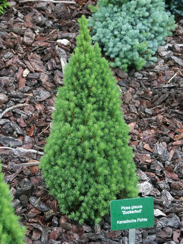 Eigenschaften: Die Weißfichte ´ZUCKERHUT‘ ist eine Zwergsorte mit sehr langsamem Wachstum. Sie bildet einen dichten, schmalen grünen Kegel mit winzigen Nadeln von 6–12 mm Länge, die dunkelgrün gefärbt sind. Die Sorte entstand in Deutschland als Mutation der Sorte ‚Conica‘. Der jährliche Zuwachs beträgt nur 6–7 cm; im 20. Jahr erreicht die Pflanze eine Höhe von 1–1,25 m.