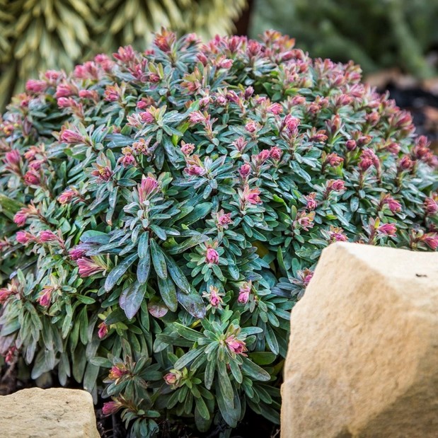 Eigenschaften: Die Wolfsmilch 'ASCOT PETITE' bildet einen kompakten Büschel mit einem nahezu symmetrischen kuppelförmigen Wuchs. Die violetten Stiele mit den schmalen, graugrünen Blättern entwickeln im Herbst rötliche Spitzen. Sie blüht im Spätfrühling bis Frühsommer mit gelbgrünen Blüten. Sie werden am Rand von Staudenbeeten, als Wegebegrenzung oder in Blumentöpfen verwendet.