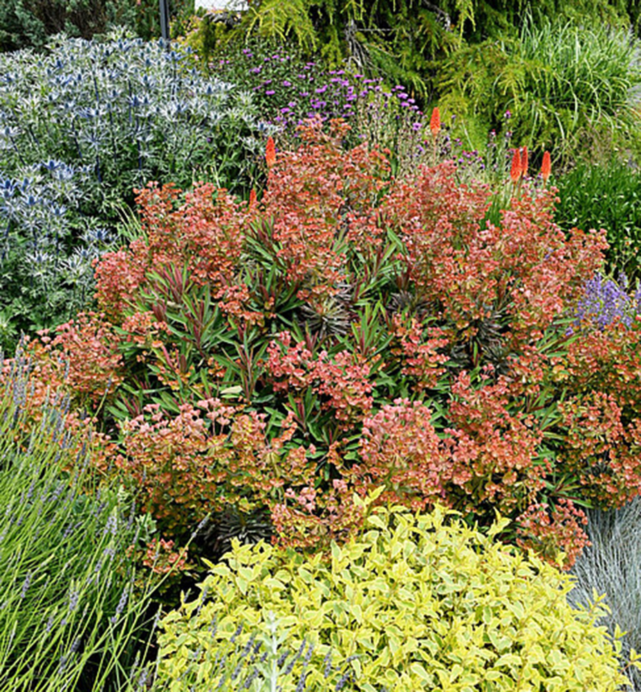 Eigenschaften: Die Wolfsmilch ´GALAXY GLOW´ ist eine beeindruckende Sorte, die sich durch üppige, schmal geformte blaugrüne Blätter auszeichnet, die einen hellrosa Farbton annehmen können. Sie blüht außergewöhnlich lange mit grünlich-gelben Blüten, die im Alter zu korallenrosa heranreifen. Dank ihrer einzigartigen Farbe passt sie perfekt in Kombination mit anderen grünlich blühenden Wolfsmilchen sowie weiteren blühenden Stauden, mit denen sie eine kontrastreiche Kombination ergibt.