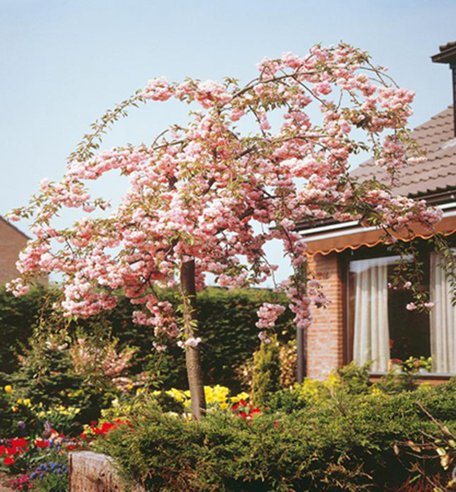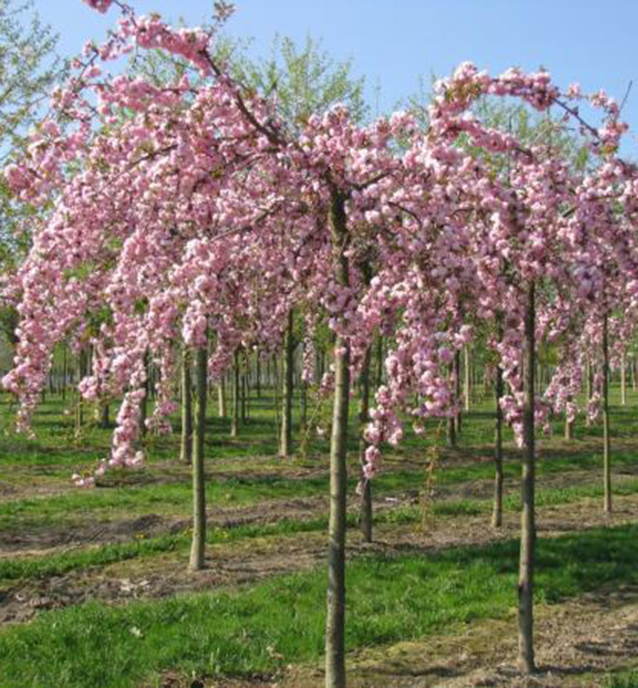 Eigenschaften: Die Zierkirsche ´KIKU SHIDARE‘ ist ein malerischer Zierbaum mit einer schirmförmigen Krone. Überhängende Triebe wachsen bis zum Boden. Ab April blüht sie mit vielen satten rosa Blüten, mit denen die blattlosen Triebe regelrecht bedeckt sind. Die Blüten wachsen in Büscheln und sind etwa 6 cm groß. Die Blätter sind glänzend, oval mit gezacktem Rand und haben beim Austrieb einen leichten Bronzeton. Später verfärben sie sich grün und im Herbst orange. Sie wird als Solitär im Rasen besonders hervorstechen.