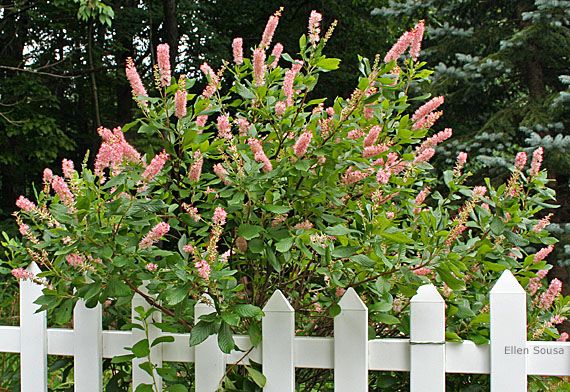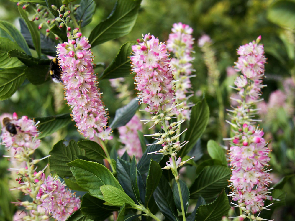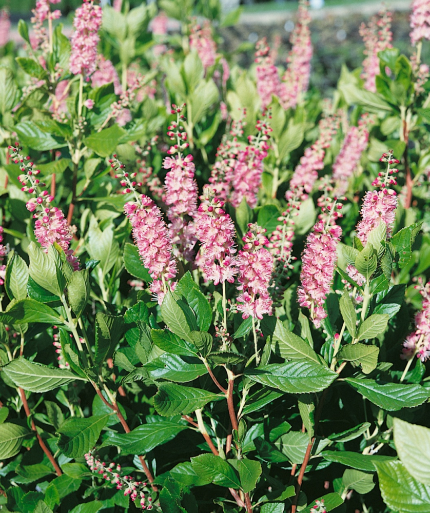 Eigenschaften: Der erlenblättrige „RUBY SPICE“ ist ein mittelhoher Strauch, der von Juli bis September blüht. Aus dunkelrosa Knospen entwickeln sich weiße bis rosa Blüten, die in langen, aufrechten Trauben angeordnet sind. Die Blüten duften sehr angenehm und süß und sind eine tolle Attraktion für Schmetterlinge und Bienen. Die Laubblätter sind oval, glänzend, an den Rändern fein gesägt und von frischgrüner Farbe. Im Herbst verfärben sie sich gelbbraun.