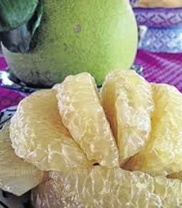 Eigenschaften: Citrus grandis 'SIAMENSIS' gehört zu den späten Zitrussorten, die unter dem Namen Pomelo bekannt sind. Er wächst in Form eines Dornenbaums und ist sehr fruchtbar. Die Blätter sind dunkelgrün, eiförmig. Die Früchte sind sehr groß (12,5-15 cm), haben eine birnenförmige Form und eine ausgeprägte gelbgrüne Schale, die bei Vollreife gelb ist. Die Schale ist 2 cm dick, glatt und glänzend. Das gelbe Fruchtfleisch lässt sich leicht von der Schale lösen und ist in kleinere saftige Halbmonde unterteilt. Es hat einen ausgezeichneten Geschmack, es ist leicht säuerlich, bei Vollreife kann es deutlich süßlich sein. Diese Sorte ist nicht selbstbestäubend. Die Früchte halten sich sehr lange am Baum.