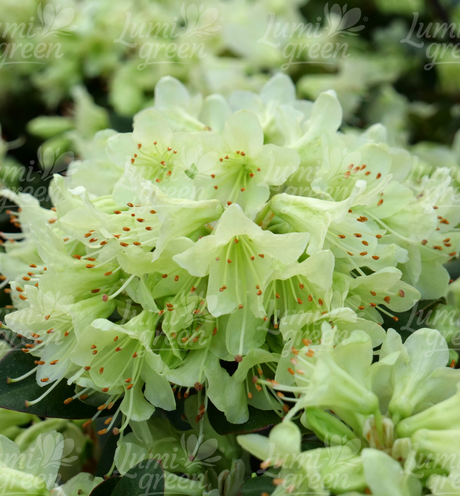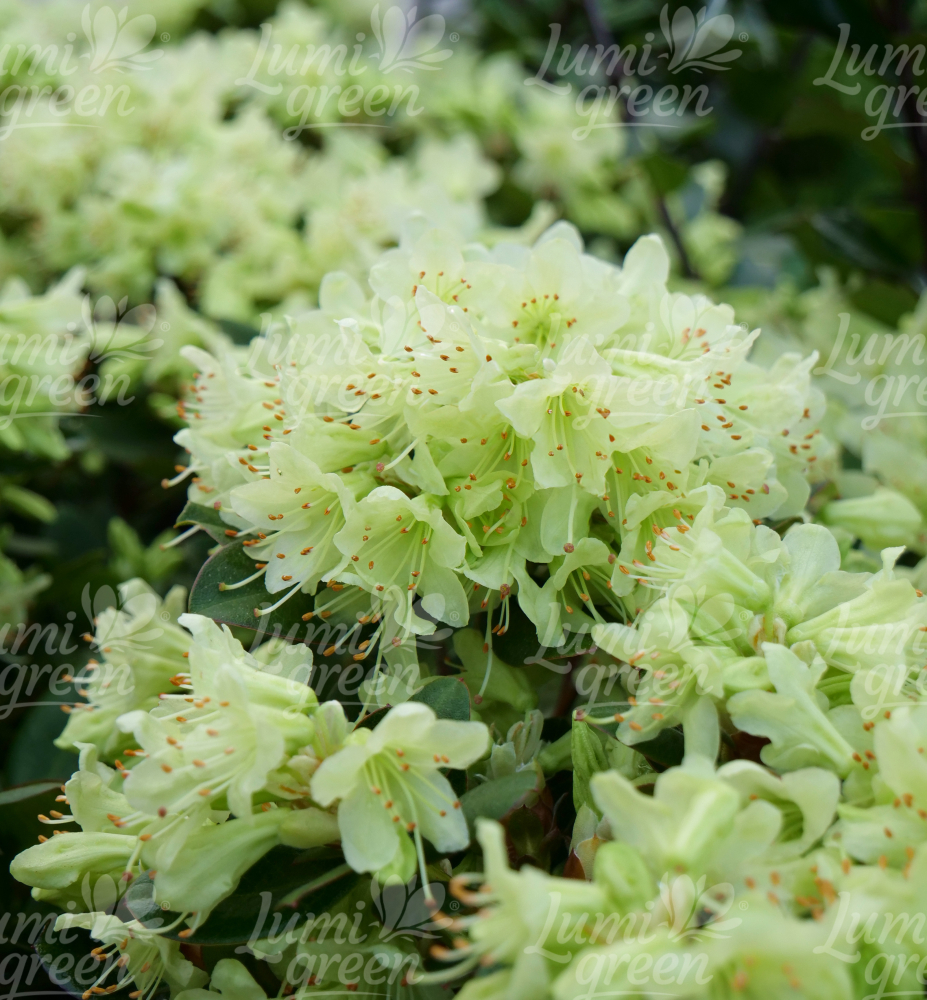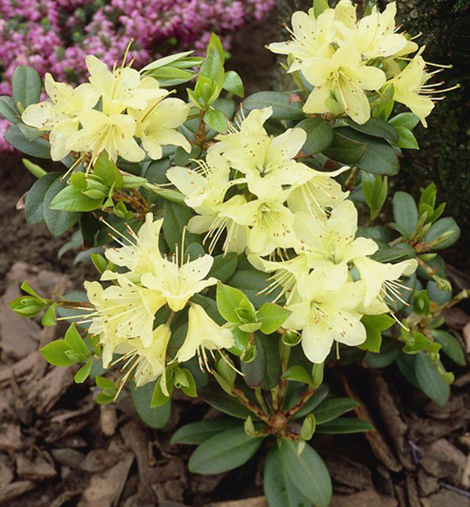 Eigenschaften: Rhododendron ´SHAMROCK‘ zählt zu den Zwergsorten. Er blüht üppig mit kleinen, hellgelben Blüten und verträgt direkte Sonneneinstrahlung gut. Er erreicht eine Höhe von 0,3–0,6 m und eine etwas größere Breite und bildet so einen schönen, ovalen Solitär. Die Blätter sind ledrig, olivgrün und nehmen im Winter sowie beim Austrieb eine bronzene Färbung an. Diese Sorte wächst langsam.