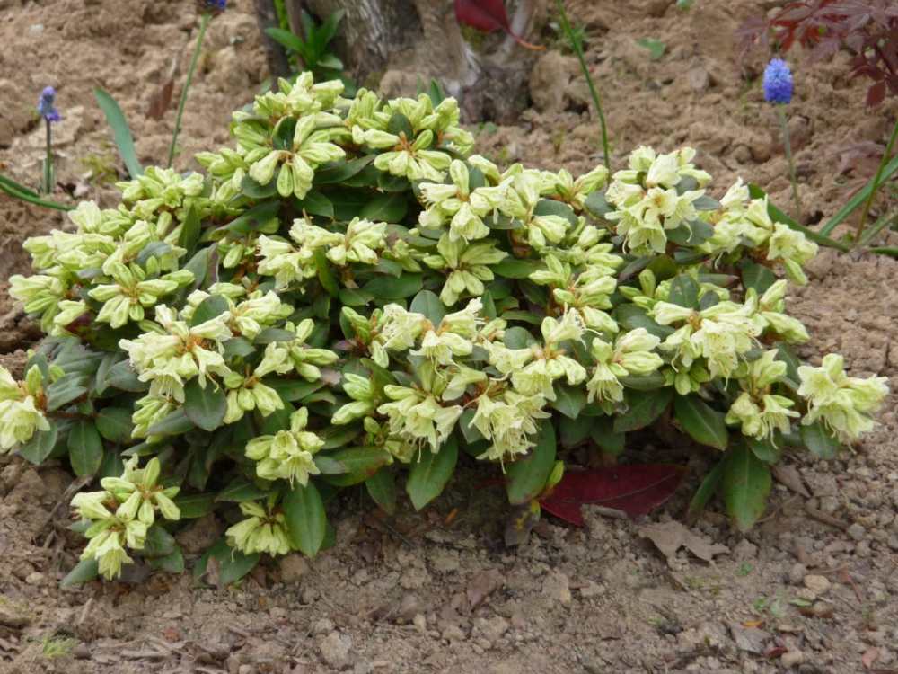 Zwerg-Bodendecker-Rhododendron mit gelbgrüner Blüte.