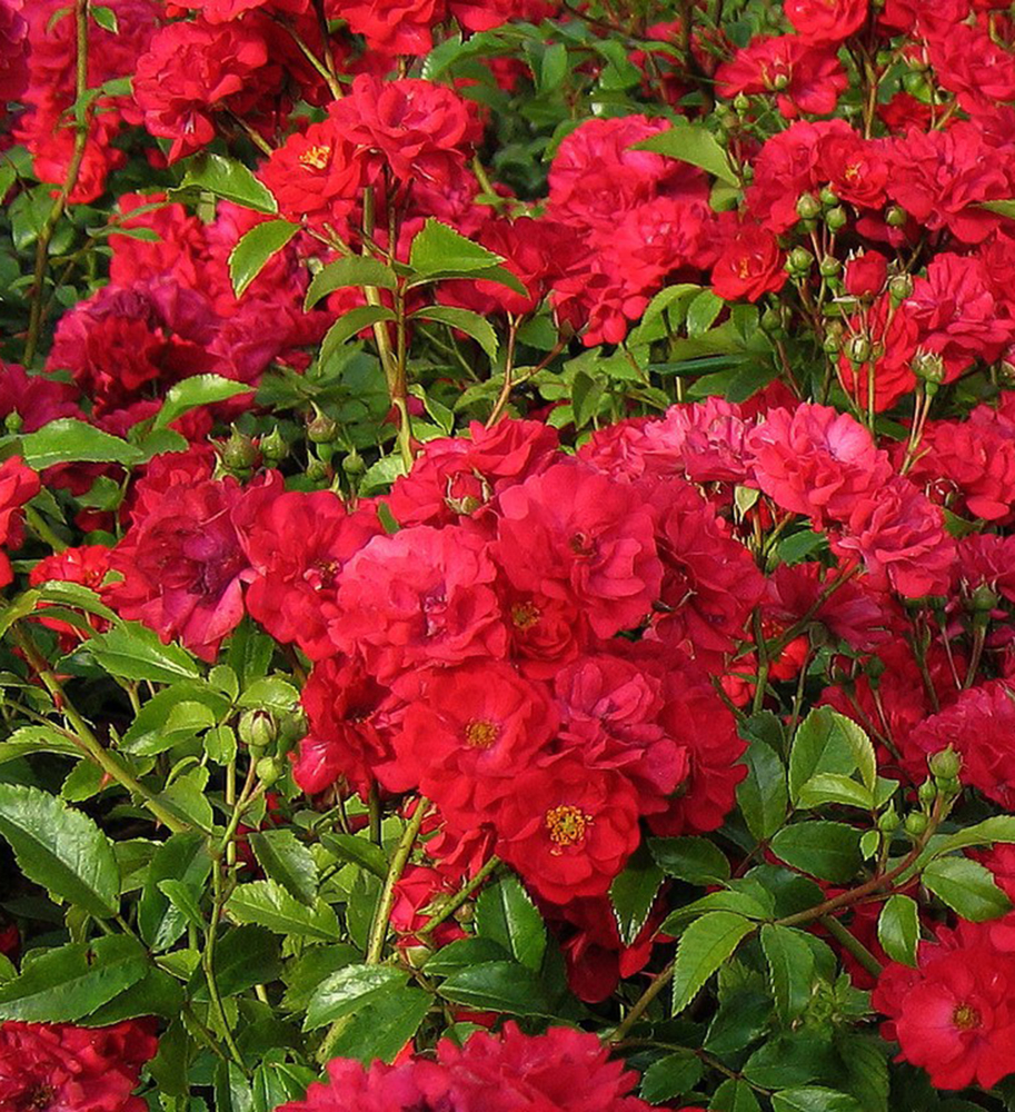 Üppig blühende Rose mit zart duftenden, dunkelroten Blüten.