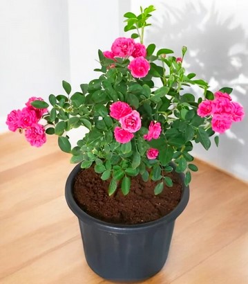 Miniaturrose mit attraktiven rosa Blüten, ideal für die Pflanzung in Töpfen.