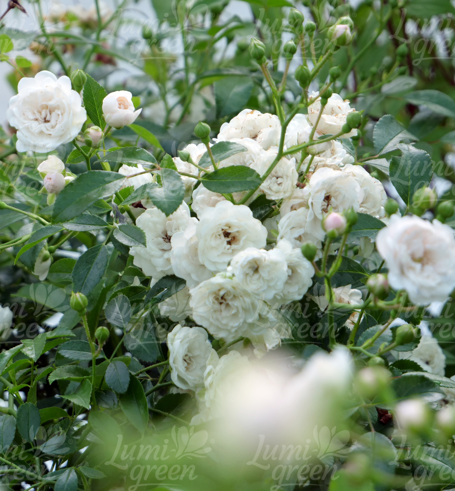 Wunderschöne Rose „Sea Foam“ – blüht üppig und lange mit vollen schneeweißen Blüten.