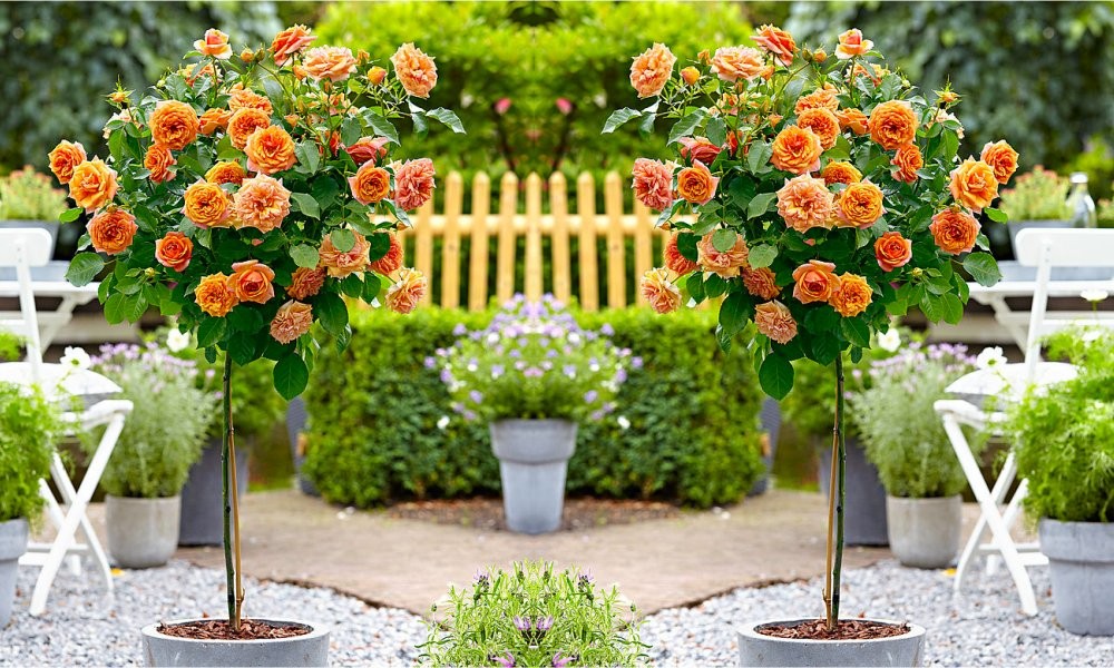 Baumminirose mit attraktiven orangefarbenen Blüten mit angenehmem Aroma.