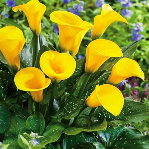 Eigenschaften: Zantedeschia ist eine feuchtigkeitsliebende Pflanze, die ursprünglich aus Südafrika stammt. Aus den hohlen Stängeln wachsen große dunkelgrüne Blätter. Die Blätter glänzen mit dekorativen weißen Flecken und sind 40 cm groß. Die Blüten haben eine leuchtend gelbe Farbe und einen angenehmen Duft. Er wird 70 cm hoch. Die Pflanze eignet sich auch zum Pflanzen in Töpfen.